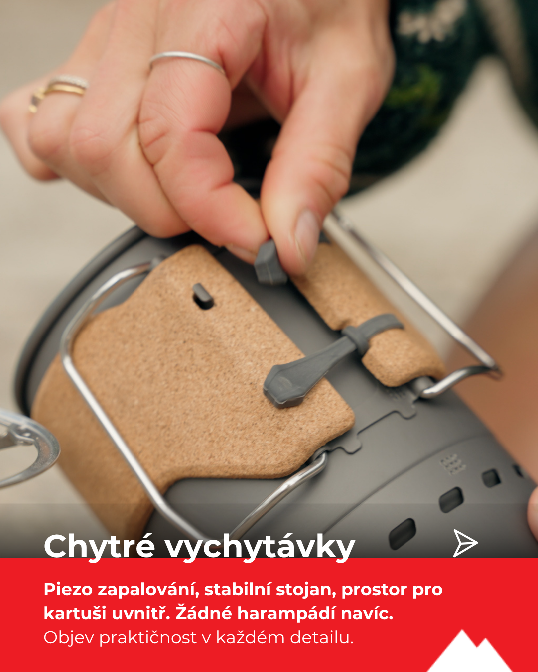 Mysli na stabilitu: Vyšší těžiště vařiče znamená, že na nerovném povrchu se vyplatí použít stojánek na kartuši, který je součástí balení.